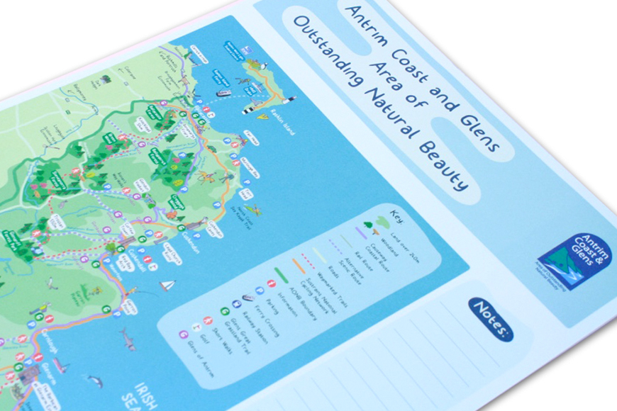 The purpose of the brief was to promote the area and highlight the main attractions and points of interest within Binevenagh. In doing so we produced a twelve page, fold out guide which included beautiful photographs of the area, descriptions, useful contacts and a custom hand drawn illustrated map to pin point the exact locations and attractions.